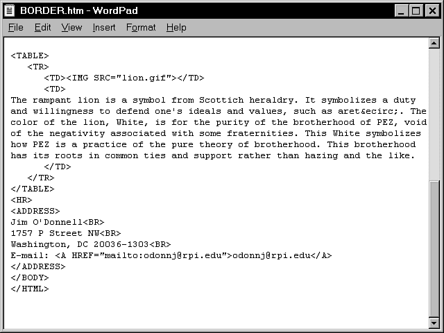 Consider the HTML document shown in figure 13.24. This document includes graphics and text information, and is meant to display it as a sort-of trading card. (Forgive the shameless self-promotion, but it was the only hockey picture I have!) This document is shown, as rendered by Netscape Navigator, in figure 13.25.