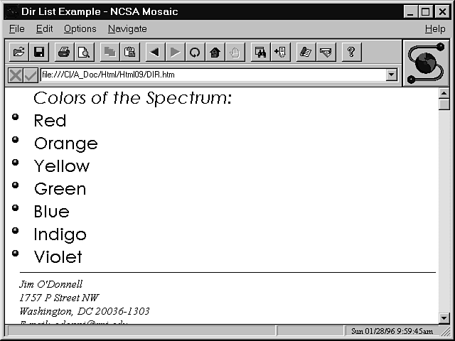Browsers don't provide, by default, any unique display attributes for the <DIR> element. As with menu lists, Netscape Navigator and Microsoft Internet Explorer render directory lists just like unordered lists (Microsoft Internet Explorer without the bullets). My version of NCSA Mosaic also renders them as unordered lists, though in a different font and style (see fig. 9.14).