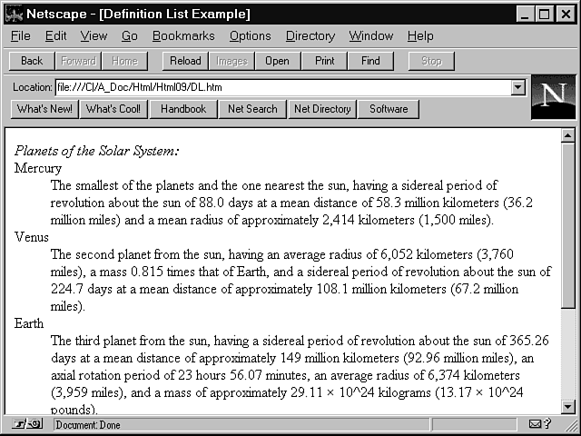 The <DT> tag's text should fit on a single line, but it will wrap to the next line without indenting if it runs beyond the boundary of the browser window. The <DD> tag displays a single paragraph, continuously indented one or two spaces beneath the term element's text (depending on how the browser interprets a definition list).