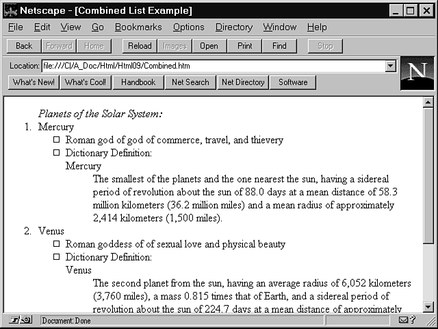 In the example in figure 9.17, I used three list types: numbered, bulleted, and definition. The primary list is a numbered list of planets. Each planet has a bulleted sublist indicating the Roman god after whom it was named, followed by its dictionary definition. I'm relying on the users' browsers to indent embedded lists; if I want to force more indentation, I can embed the lists inside additional, empty lists. For instance, instead of the following:
