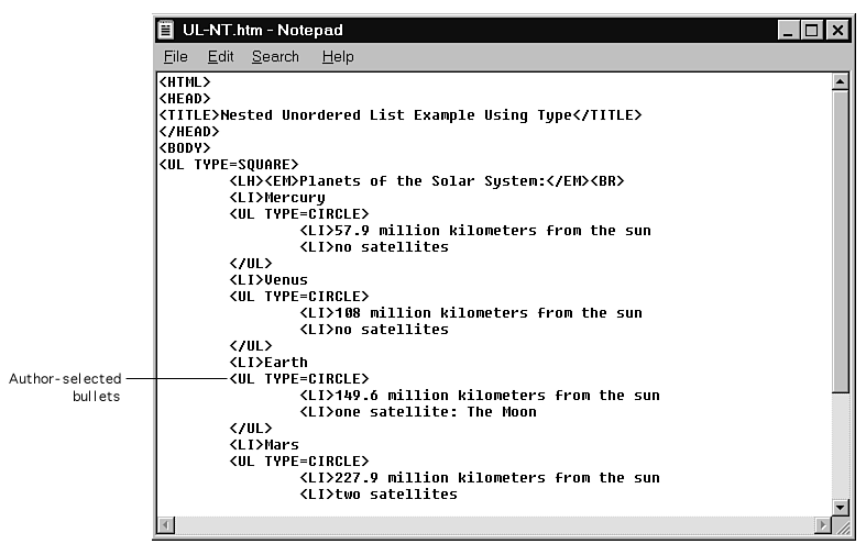 Unordered lists use the <UL> container tag. Just like ordered lists, bulleted lists provide beginning and ending line breaks and support internal HTML elements and sublists. Also, like ordered lists, they require closing tags: include the </UL> tag to signal the end of the list to the browser. Web browsers support and automatically indent sublists, and some will also vary the bullet icon based on the relative level of the list. These icons vary depending on the client software viewing the HTML document.