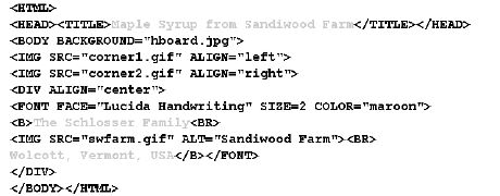 How did I make the site in Figures 17.1 and 17.2? First, I created the contents of each frame as an ordinary HTML page. These pages (listed in Figures 17.4 through 17.7) don't contain any tags that you haven't already seen in other chapters.