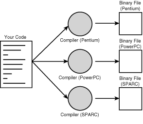Normally, when you compile a program written in C or in most other languages, the compiler translates your program into machine code or processor instructions. Those instructions are specific to the processor your computer is running-so, for example, if you compile your code on an Intel-based system, the resulting program will run only on other Intel-based systems. If you want to use the same program on another system, you have to go back to your original source code, get a compiler for that system, and recompile your code so that you have a program specific to that system. Figure 1.2 shows the result of this system: multiple executable programs for multiple systems.
