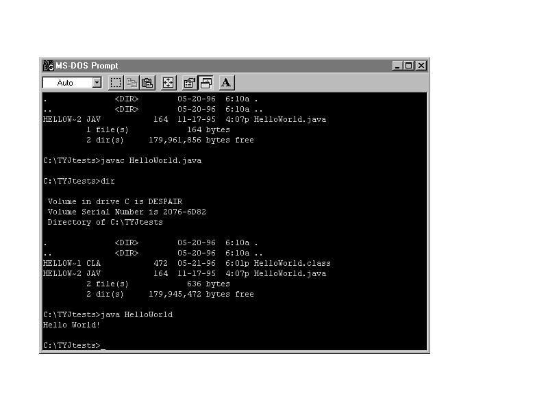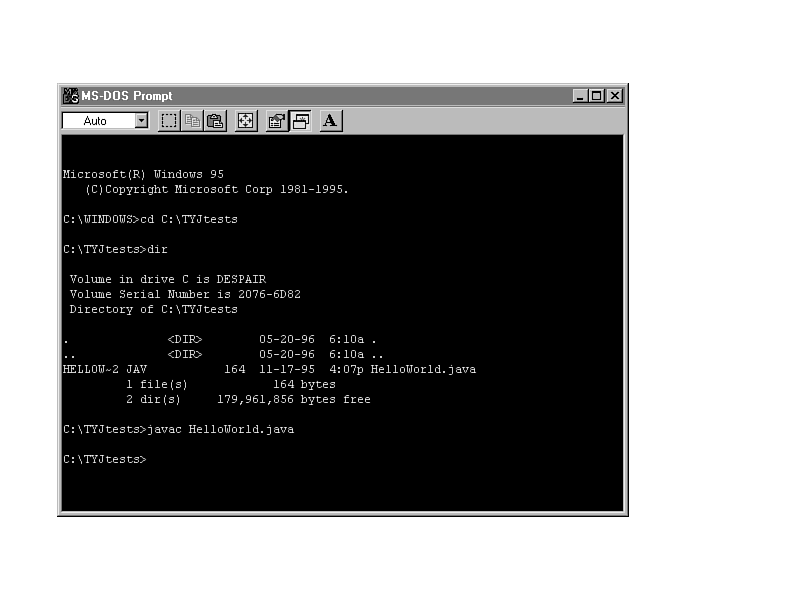 The reason that I've emphasized using the original filename is that once you're inside the DOS shell, you might notice that your nice long filenames have been truncated to old-style 8.3 names and that, in fact, HelloWorld.java actually shows up as HELLOW~1.jav. Don't panic; this is simply a side effect of Windows 95 and how it manages long filenames. Ignore the fact that the file appears to be HELLOW~1.jav and just use the filename you originally used when you saved the file. |