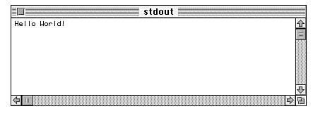 Once you've successfully generated a HelloWorld.class file, simply double-click it to run it. The application Java Runner, part of the Mac JDK, will start, and the program will ask you for command-line arguments. Leave that screen blank and click OK. A window labeled stdout will appear with the message Hello World!. Figure 1.6 shows that window.