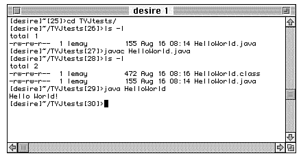 The JDK for the Mac comes with an application called Java Compiler. To compile your Java source file, simply drag and drop it on top of the Java Compiler icon. The program will compile your Java file and, if there are no errors, create a file called HelloWorld.class in the same folder as your original source file. |