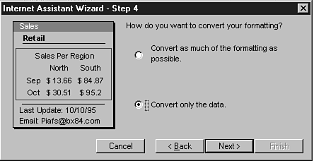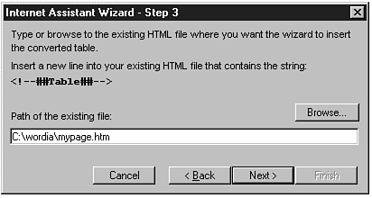 Perhaps the single greatest feature of the Internet Assistant for Word is its ability to convert existing Word documents into HTML quickly and easily. In a few simple steps, the Internet Assistant will convert any graphics present in the document and add the HTML tags that most closely match the existing formatting of the document. The resulting document, complete with graphics, tables, bullets, and headings, is ready for movement onto a Web server. All this is done without having to know a single HTML tag.