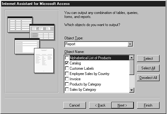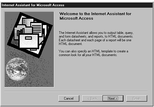 Select Internet Assistant. This will start the Internet Assistant for Microsoft Access Wizard (see Figure 10.14), and present you with an introductory dialog box. Press Next to continue running the Wizard.