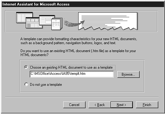 Utilizing Templates Internet Assistant for Access provides the option of using a template when converting Access data to HTML. The template essentially provides a format for the presentation of the data. Data from Access objects can be placed between text on a page that contains background colors, button bars, and so on.