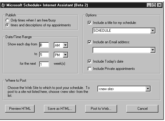 The Where to Post group includes a feature that is not currently implemented in this beta of Internet Assistant for Schedule+. When completed, it will provide the functionality of being able to publish schedule information directly to a specific Web site.