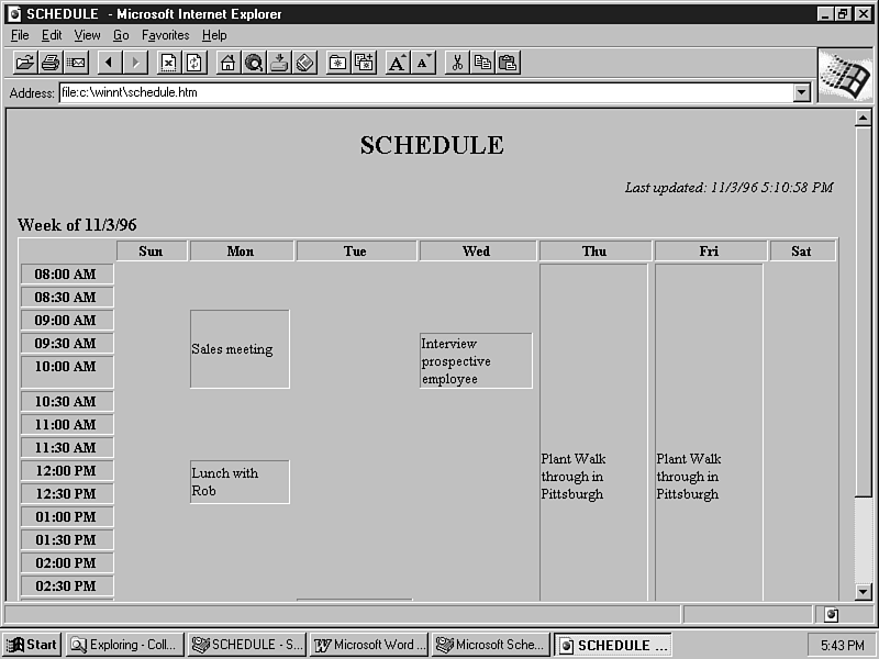 After you select all the configuration settings and press the Save as HTML button, the Internet Assistant for Schedule+ will create a stand-alone HTML file with schedule information. Open the file in your browser to view your schedule (shown in Figure 10.18).