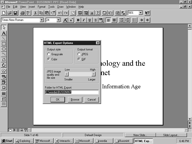 The Internet Assistant for PowerPoint provides several configuration options (see Figure 10.19). The first of these is the output style of the pages. Pages can be produced in grayscale, or in color. The output format of the images can also be configured, with a choice between .JPEG and .gif format. If JPEG is selected, the quality of the image resolution can be configured. Finally, a folder needs to be selected where the HTML files and graphics will be saved.