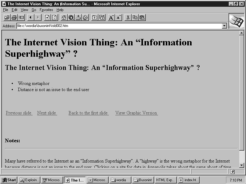 Selecting the first hyperlink (linked to the first page of the presentation) will show the power of the Assistant. The graphic from the presentation has been converted to a .gif format, and hyperlinked buttons have been added to the bottom of the page. Buttons on the pages are linked to take you to the next page of the presentation, the previous page of the presentation (if appropriate), back to the index page, and to the notes page (see Figure 10.21). Click the button with the letter A to view a notes page.