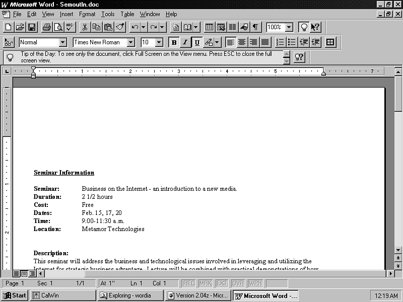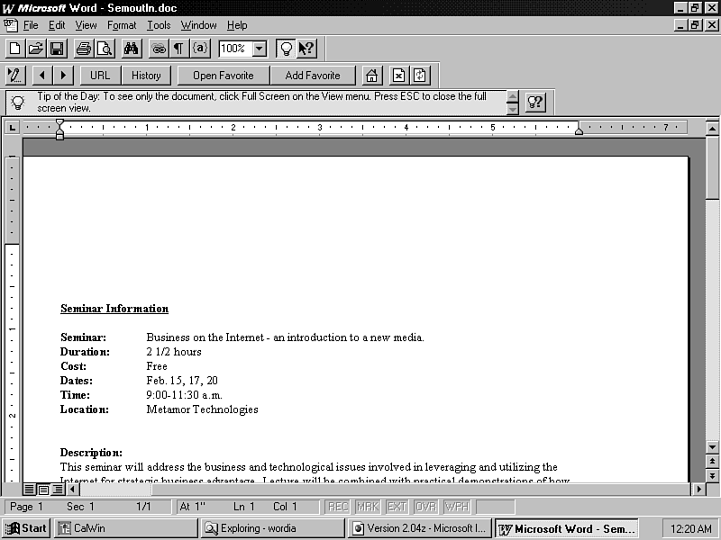 The Internet Assistant for Word is an add-in that allows you to use your existing knowledge of Word to create new HTML documents-as quickly and easily as converting existing Word documents into HTML. It allows you to add HTML features such as hyperlinks, tables, and form fields to your documents. It also provides Word with limited Internet browser capabilities for viewing newly created HTML documents. The Internet Assistant for Word may not be the tool to use if you are trying to create high-graphic, dynamic Web pages. However, it is an extremely effective, efficient, and simple tool to use for creating a new HTML content-intensive document and the conversion of existing Word documents for Web publishing.