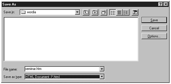 When converting Word documents that have images or graphics, save the resulting .htm file to an empty directory. When documents are converted to HTML, all images are converted from their native format to .gif format and saved. When moving your new HTML document to the Web server, you will have to move the .htm file and all associated .gif files. By having them all in a clean directory, there will be no confusion as to which graphics are associated with which document. |
