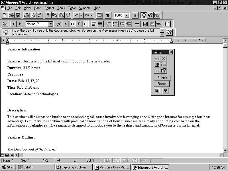 Remember that designing the form is only half of the work. The front-end form (the interface) is merely a data-collection mechanism for a CGI (Common Gateway Interface), ActiveX component, JavaScript, or VBScript running in the background. Forms that you build with the Internet Assistant will require an application linked to it to perform any sort of function over the Internet or intranet. |
