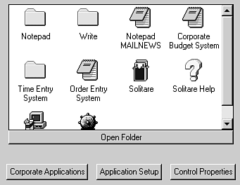 The DameWare intraApp control implements a virtual desktop or application launcher that enables the user to set up and host local or Web based applications. This can act as a home page for applications, especially for intranet applications. The application icons, title, and so on, are laid out in a configuration file (the format is the same as the Windows INI file).