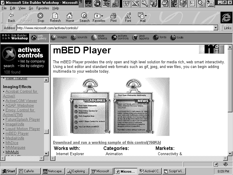 The mBED Player Control for ActiveX from mBED Software allows you to incorporate interactive animation into your Web site by displaying "mBEDlets" through the mBED player (see Figure 16.2).