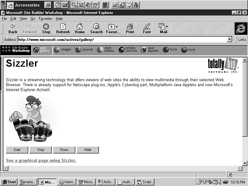 The Sizzler Control for ActiveX from Totally Hip Software allows you to incorporate streamed animation into your Web site by displaying Sizzler animation files (see Figure 16.3).