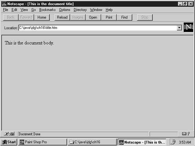 The title of an HTML document is typically displayed at the top of the browser window, as shown in Figure 16.2. The title is placed in the head of a Web document and is surrounded by the <TITLE> and </TITLE> tags.