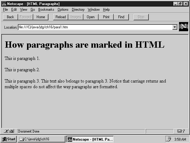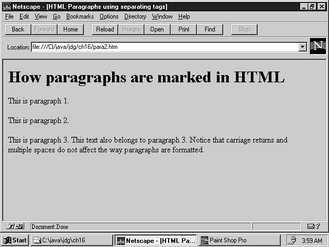 Paragraph tags are used to mark paragraphs within HTML documents. In HTML, spaces, tabs, carriage returns, and line feeds are referred to as whitespace characters. One or more whitespace characters are normally displayed as a single space by Web browsers. In order to mark the beginning and end of a paragraph, the HTML paragraph tags, <P> and </P>, must be used. For example, the HTML shown in Listing 16.3 illustrates the use of paragraph tags. Figure 16.4 shows how this HTML is displayed by a Web browser.