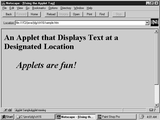 You can compile SampleApp.java using the command javac SampleApplet.java. Create the sample.htm file shown in Listing 16.5 and store it in your \java\jdg\ch16 directory. Then open the sample.htm file using your Web browser. This should result in a display similar to that shown in Figure 16.6.