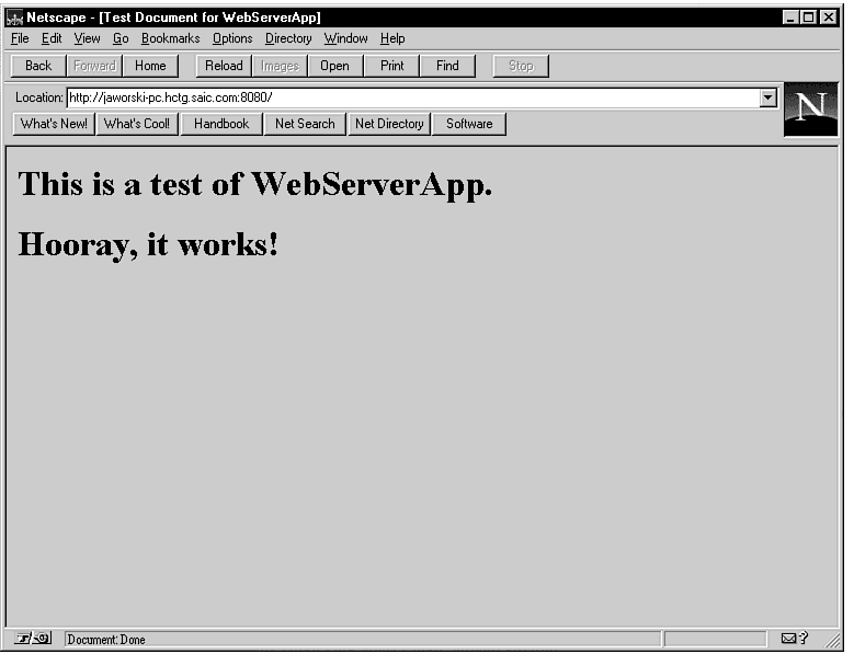 When you access the URL http://my.host.name.com:8080, WebServerApp is instructed to return the default no name HTML file. It responds by sending index.htm to the Web browser. Your browser's display should contain the message shown in Figure 27.1.