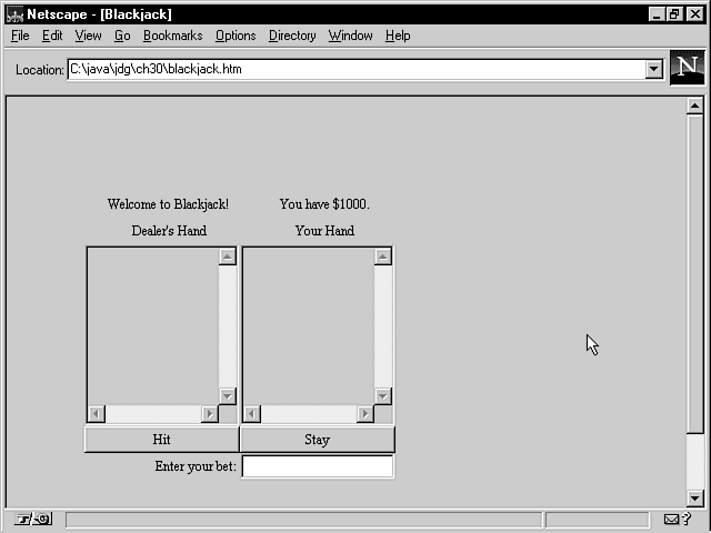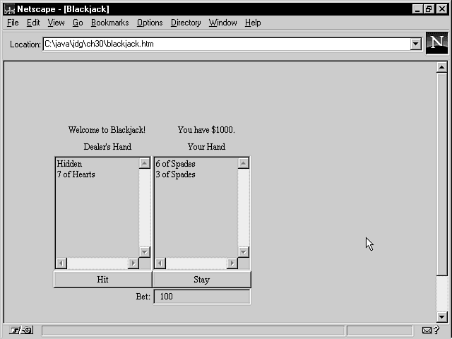 Open the blackjack.htm file with your browser. Your browser should display the applet, as shown in Figure 30.3.