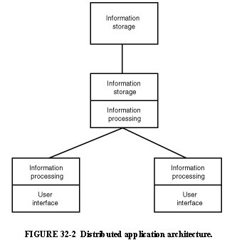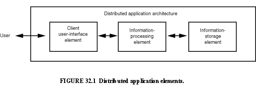 Even though most programs consist of some manifestation of these three elements, it is not necessary that they be implemented on the same computer. In fact, separating the elements of an application over more than one computer may lead to greater modularity and more efficient use of processing resources. Distributed applications are based on this notion. Figure 32.2 illustrates a typical distributed application architecture.