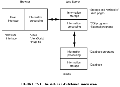 Figure 32.3 shows how the Web is organized in terms of the user-interface, information- processing, and information-storage elements of distributed applications.