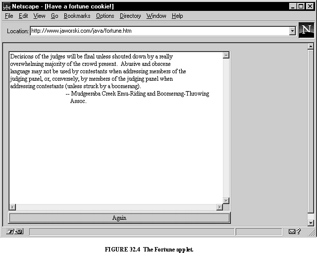 The Fortune applet makes a connection to the fortune CGI program located in my /cgi-bin directory. It then reads the fortune cookie generated by this program and displays it in the text window. When you click on the Again button, it establishes another connection to the CGI program, obtains another fortune cookie, and displays the new cookie in the text window.