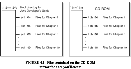 The CD-ROM that accompanies this book has an analogous directory structure to the one that you'll create. It contains the source and bytecode files for each example in the book. If you don't want to type in any of the sample programs, you can simply copy them from the CD-ROM. The CD-ROM also contains images, audio and video files, and other files used in the examples.
