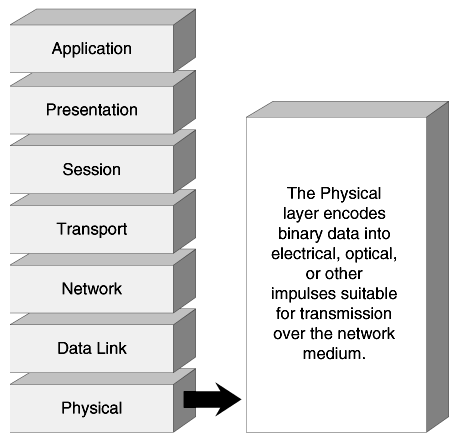 Therefore, what we have at the physical layer is the most fundamental element of the communications process. The upper layers of the model reduce the data to be transmitted down to binary code, and it is the sole function of the physical layer to see that those ones and zeroes are transmitted from one location on the network to the next. The physical layer is completely oblivious of the nature of the data that it is transmitting. It is not concerned with packets, frames, addressing, or the ultimate destination of the data. It cannot read the binary code that it is transmitting, beyond a basic awareness of the difference between a zero and a one, which it converts into suitable impulses of electricity or light that can be sent over the network medium. Each transmitting device on the physical layer is aware of nothing but its adjacent neighbors on the network, from whom it receives and to whom it is responsible for sending these impulses, in whatever form they may take.