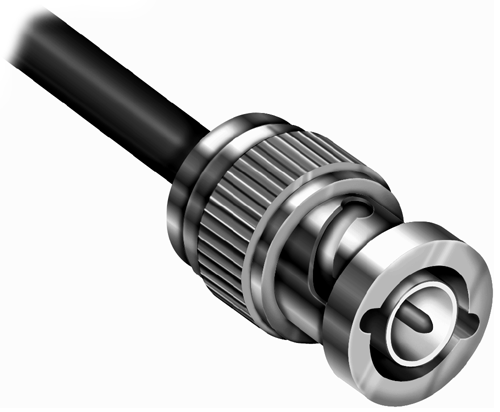 Unlike thicknet, which may be tapped for attachment to a computer without breaking the cable, individual lengths of thinnet cabling are used to run from one computer to the next in order to form the bus topology (see fig. 7.6). At each Ethernet interface, a "T" connector is installed. This is a metal device with three Bayonet-Neill-Concelman-type connectors (BNC): one female for attachment to the NIC in the computer, and two males for the attachment of two coaxial cable connectors (see fig. 7.7). The cable at each machine must have a female BNC connector installed onto it, which is attached to the "T." Then a second length of cable, similarly equipped, is attached to the third connector on the "T" and used to run to the next machine. There are no guidelines in the standard concerning cable lots or the number of breaks that may be present in thinnet cabling. The only rule, in this respect, is that no cable segment may be less than 0.5 meters long.
