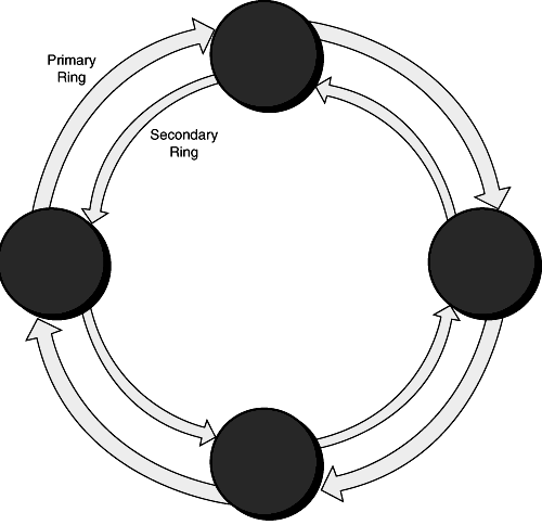The FDDI standard was created by the ANSI X3T9.5 committee. The document describes a network laid out in a dual ring topology, using the same token passing media access control mechanism that token ring uses, except that early token release is always used, instead of being optional. The dual ring provides two independent loops with traffic traveling in opposite directions to provide fault tolerance for the network (see fig. 7.12).
