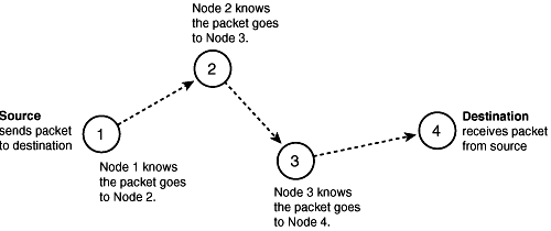 One of the primary functions of IP is routing, which is the process of directing datagrams over a network. IP only keeps track of the first hop, or jump to another network. For example, if you send an e-mail message to someone, your message hops from network to network until it reaches its destination. Each node in the path only knows two things: the node the packet just came from and the next node in the path. This procedure is called store and forward routing and is controlled by IP (see fig. 10.5).