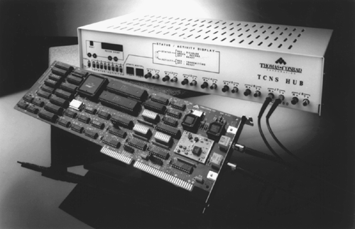 Although most hubs are stand-alone machines with their own chassis, they don't have to be--a few vendors sell hub cards that you can put in your file server (for small networks) or a dedicated hub machine (for larger networks) and thus lower the cost of a star topology. Unsurprisingly, card hubs are cheaper than stand-alones. Card hubs also have the advantage of instant intelligence, too. One model (now discontinued for reasons we'll get to in a minute) operated in cooperation with NetWare, so to make your dumb hub intelligent all you had to do was load an NLM (NetWare Loadable Module) for management capabilities.