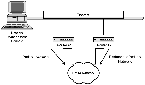 Where To Put It? You might think that deciding where to put your NMS system is a trivial issue, but realize that its connection to the network is the only way it can keep track of devices going up or down and gather statistics. If something happens on this local segment, the rest of your network may be fine, but your NMS console will never know about it. It will light up like a Christmas tree and you'll think the whole network has failed. So when you're placing your system, make sure that you have redundant paths to the rest of your network. As an example, you could connect two routers to the segment such that you have two paths to the other segments in your environment. This is illustrated in figure 30.3.
