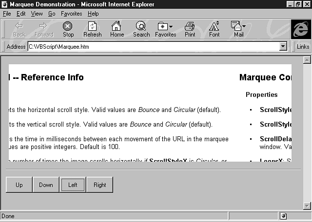 Once again, by simply changing the properties of the ActiveX control, I can change the functionality that is seen in the animation. The important things to note are the fact that ScrollPixelsX and ScrollPixelsY properties control the number of pixels the marquee will display at each interval. The interval is set at 1000 milliseconds when the object is defined, and the name of the URL that holds the HTML file to display is also set. Both of these properties could be changed at runtime with buttons or scrollbars to affect the rate at which the animation runs and which file is displaying.