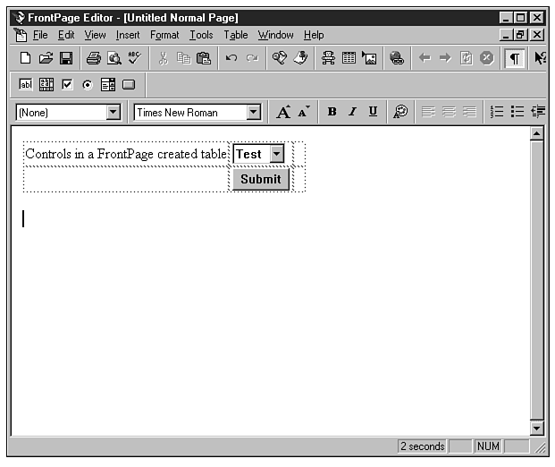 In the preceding example, controls are displayed in an HTML table. Tables offer fairly good control over where your controls are placed on a form, but it takes a little work to get the controls placed where you want them. Microsoft FrontPage allows you to create WYSIWYG (what you see is what you get) tables in Web pages. It's much easier to use a program like FrontPage to lay out a table visually, as shown in Figure 4.2.