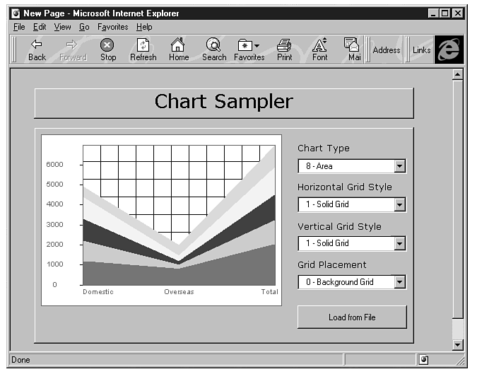 Figure 9.10 shows the ChartURL document, which is a variation on the Chart document. This time we've added a command button that causes the Chart control to read its data and settings from a local file. The file with the data and settings is called CHARTDATA.TXT, and it contains the sample data of the section titled "Supplying Data Over the Internet." When the user clicks this command button, the Chart control reads the data from the CHARTDATA file and updates the graph accordingly. The code behind the Load from File button simply assigns a value to the Chart control's URL property: