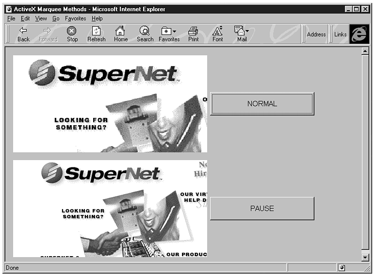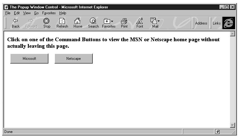 ActiveX controls provide all the functionality of a typical Windows application from within Internet Explorer's environment. But there is one function, which is so common among Windows applications, that isn't available to your VBScript applications-the menu bar. HTML layouts don't have a menu bar, and there's no ActiveX control you can place on a layout that would provide the functionality of a menu bar. There are, however, two ActiveX controls that provide a similar functionality. They are not as convenient or flexible as the elaborate Windows menu structures, but they provide the basic functionality of a menu structure. They are the Popup Menu control, which causes a popup menu to be displayed anywhere on the browser's window, and the Menu control, which is a like a custom command button that displays a drop-down menu every time it's clicked.