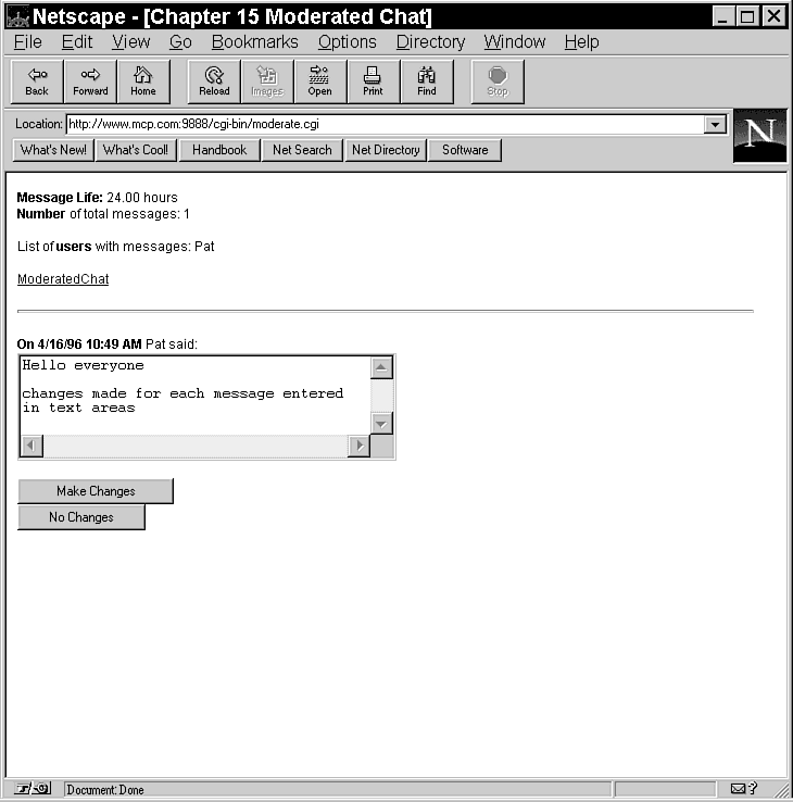When the user enters the ModeratedChat environment, it doesn't appear that the environment is being monitored (see Fig. 15.12). The user has no idea that there is someone else watching over the chat dialog. For the person monitoring the moderated chat environment, there is a special page generated by the CGI script moderate.cgi in Listing 15.3.