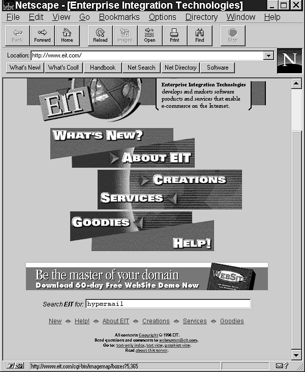 There is a great HTML page on the Web that contains very specific information about Hypermail. That page is located at http://www.eit.com/goodies/software/hypermail/hypermail.html. See Figure 31.1.
