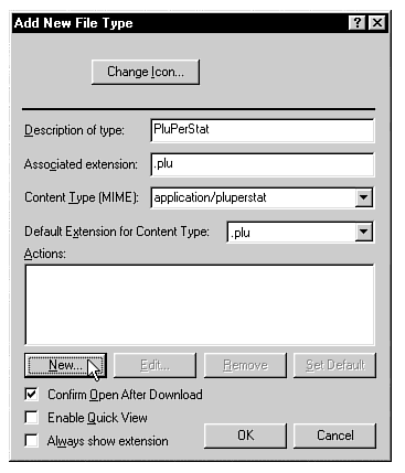 Before you can use PluPerStat as a helper application, you need to tell your Web browser about it and its MIME data type/subtype. Different browsers have different mechanisms for adding helper applications. The following section covers Explorer. If you're using another browser, check your documentation (if necessary). You will probably realize as soon as you read the steps for Explorer that the concepts can be easily applied to any browser.