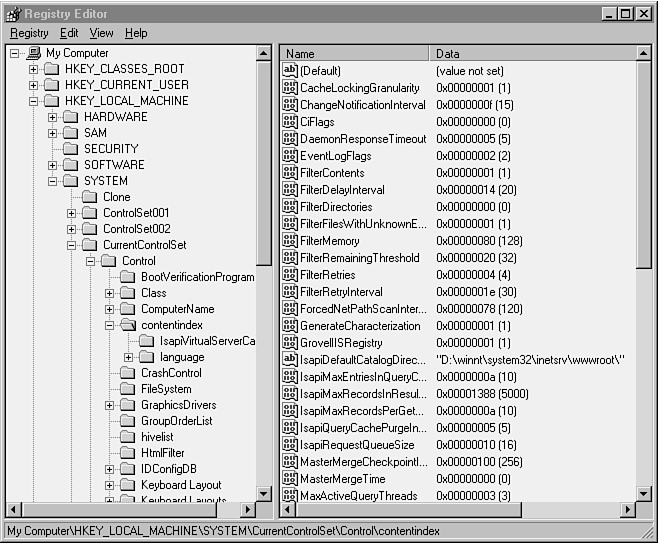Microsoft Index Server is controlled by many registry parameters, which can be edited through the use of the regedit program. These registry parameters fall into three different categories: operational parameters, virtual server and catalog parameters, and language-specific parameters.