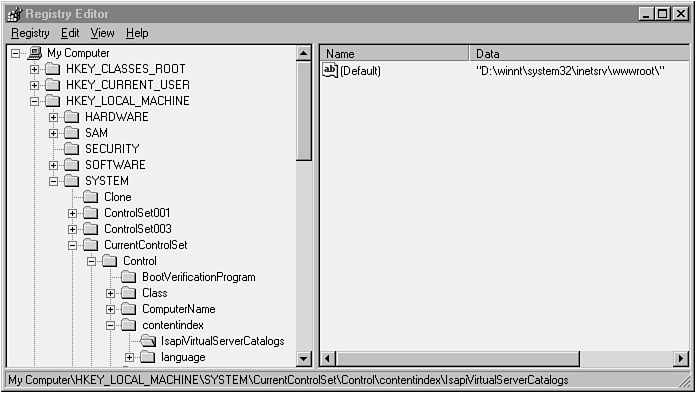 Figure A.2. Index Server virtual servers and catalogs registry parameters.