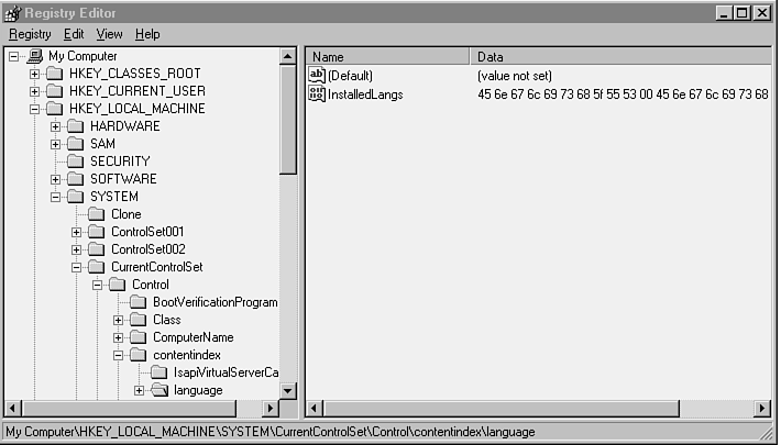 Figure A.3 displays the regedit program with the language-specific registry parameters displayed. The InstalledLangs value lists the set of languages installed. Each string in the InstalledLangs value names a subkey below the Language key.