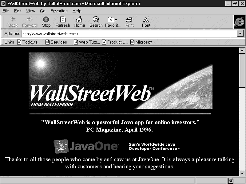 If you visit Gamelan, make your way past the thousands of programs designed for entertainment to the ones designed for their utility. These are the programs that help you develop and add to the usefulness of your intranet. A must see program for anyone tracking the commercial marketplace is the WallStreetWeb. The home page for the WallStreetWeb (www.wallstreetweb.com) is shown in Figure 1.3.