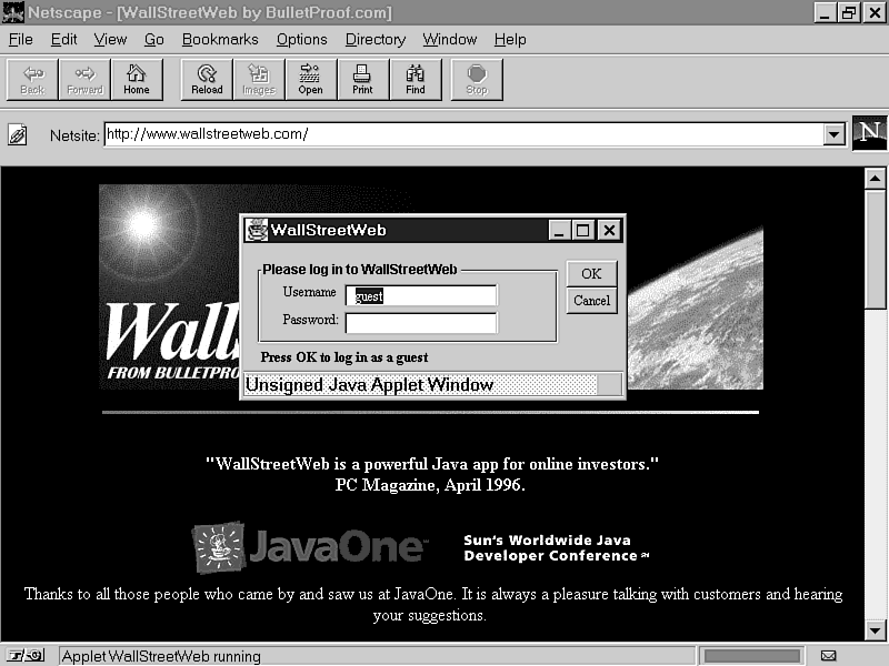 The WallStreetWeb is the perfect program to demonstrate the versatility of Java. When you access the WallStreetWeb home page, the WallStreetWeb applet is downloaded to your computer. As soon as the download finishes and the applet starts, you see a dialog box prompting you to enter a user name and password. This dialog box is shown in Figure 1.4. If you have a WallStreetWeb account, you can log in and access real-time stock quotes. If you don't have an account, you can log in as a guest. Guests have limited access to the program's features, but can obtain quotes on certain stocks.
